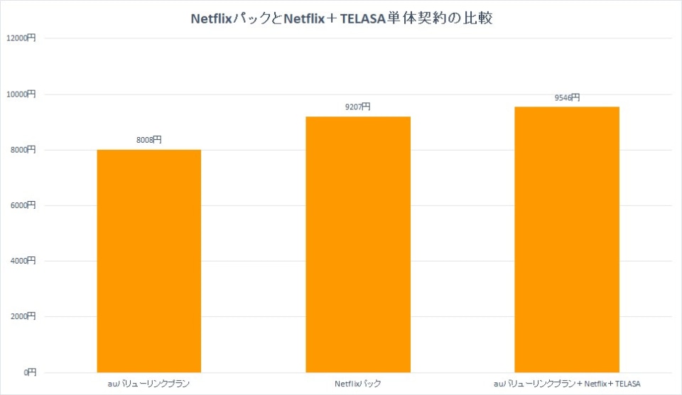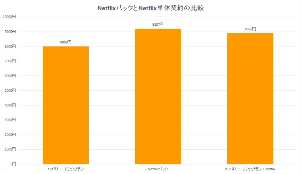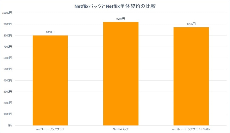 この728円を、auバリューリンクプランと合算すると、毎月の請求額は各種割引適用前で8736円になります。先に挙げたNetflixパックは9207円だったので、パックプランを契約するよりも実質471円安くなる計算。