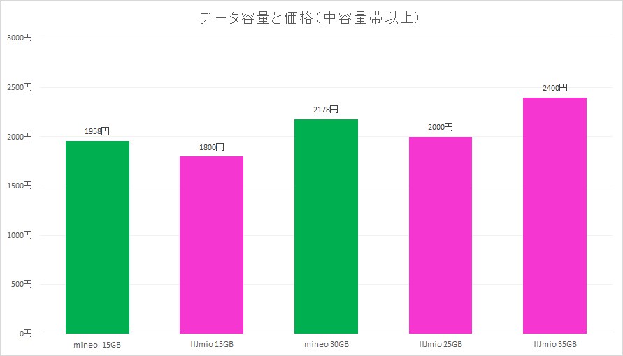これに加えて、mineoは比較的、中大容量の料金を安くしている傾向もあります。上記のように、3GBや7GBコースではIIJmioの方が割安な反面、15GBは1958円と比較的リーズナブル。IIJmioのギガプランは同容量で1800円ですが、速度制限後が3Mbpsということを考えると、mineoのよさが際立ってきます。