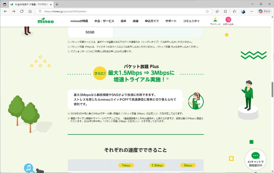 今回の容量改定に合わせ、mineoはまず12月10日にこのパケット放題Plusの通信速度を1.5Mbpsから3Mbpsへと倍速化します。位置づけとしては「増速トライアル」になっていますが、3月中旬には3Mbpsを正式サービス化する予定。