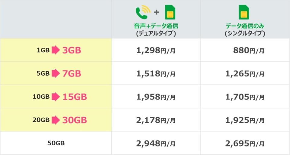 マイピタのデータ容量は5段階に分かれていました。1GB、5GB、10GB、20GB、50GBの4つです。音声通話が可能な「デュアルタイプ」はそれぞれ、1298円、1518円、1958円、2178円、2948円に設定されています。この金額はそのままに、50GBコース以外のデータ容量がそれぞれ増量されました。