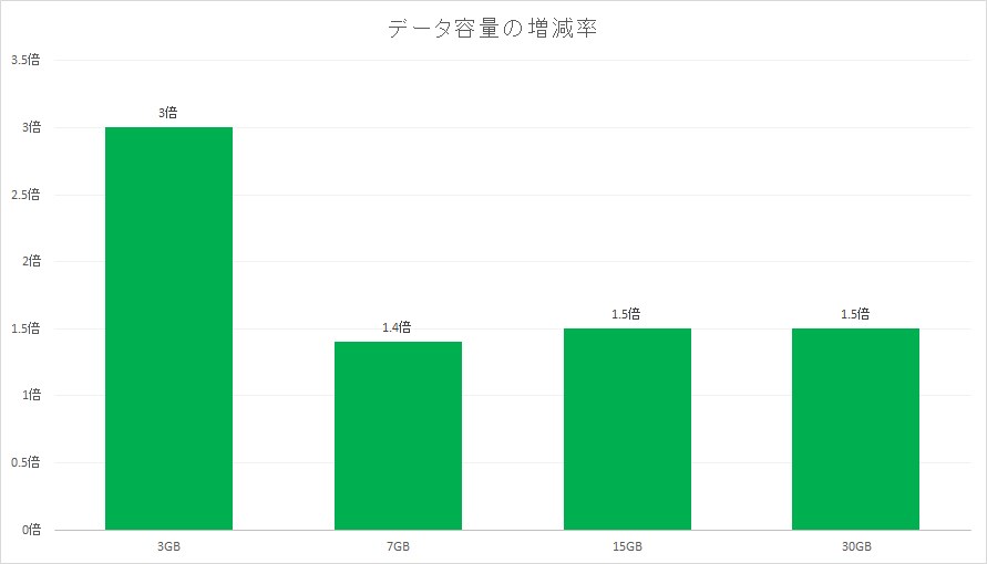 増え方は均等ではなく、1GBは3GBに、5GBは7GBに、10GBは15GB、20GBは30GBに増加しています。10GB、20GBは1.5倍に増量されたのに対し、5GBは1.4倍、1GBに至っては3倍もの増量が実現し、コース間のバランスがやや変化しています。
