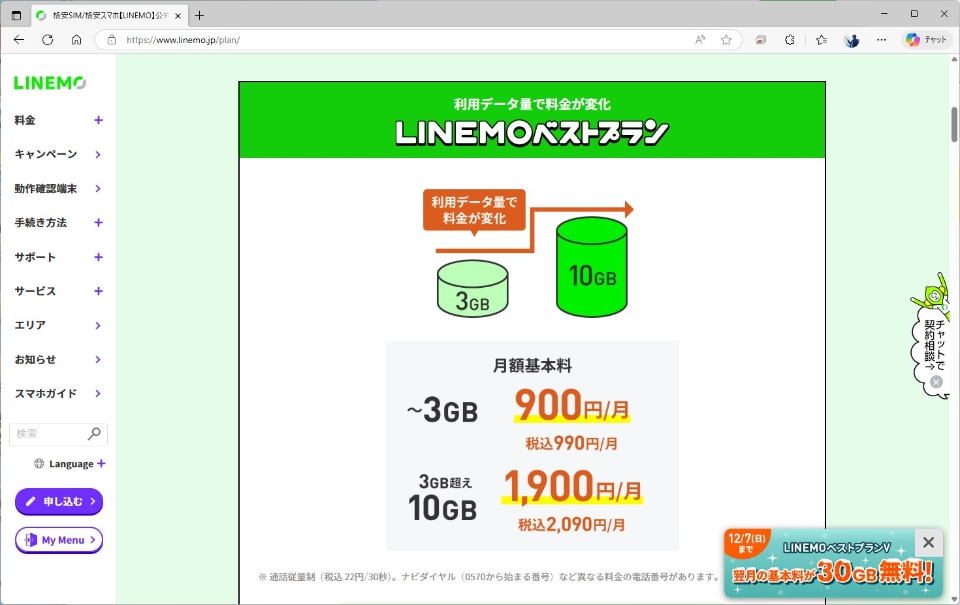 こちらも開始は12月10日。データ容量を使い切ったあとや、「mineoスイッチ」をつかって高速データ通信をオフにした場合などでも、1Mbpsでデータ通信が使い放題になるというわけです。