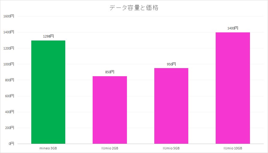 mineoより安い料金にも関わらず、データ容量が2倍もしくは5倍利用できたというわけです。