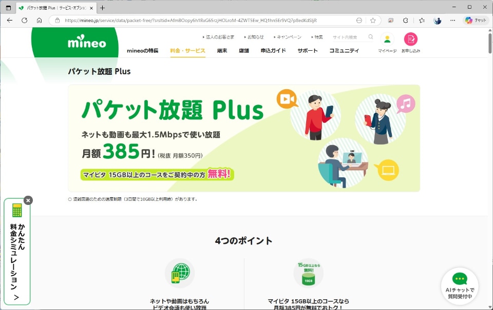 一方で、同時に発表された「パケット放題 1Mbps」まで加味すると、その見え方が変わってきます。mineoには元々「パケット放題Plus」というサービスがあり、旧10GBコース以上には無料で付帯していました。このオプションは、その名のとおり、データ容量を無制限に利用できるというもの。ただし、速度は1.5Mbpsに制限されます。