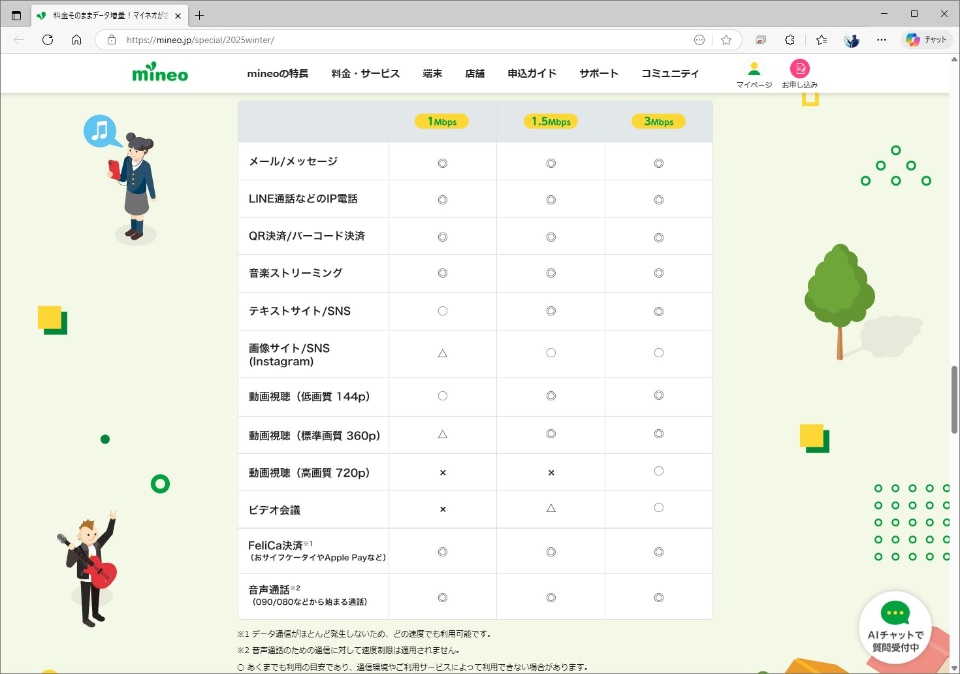 1MbpsはフルHDや720pなどの動画の再生には向きませんが、コード決済サービスやLINEなどのメッセージサービス、音楽ストリーミングであれば利用は可能。Webサイトの表示も画像が多いと引っかかりを感じることはあるものの、テキストなどは比較的ストレスないレベルで再生できます。