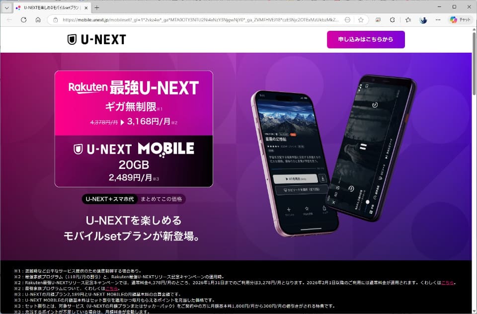 これに対し、U-NEXTが新たに立ち上げたU-NEXT MOBILEは、データ容量20GBのみ。U-NEXTとセットで契約すると、300円のセット割引が適用され、料金は1500円まで下がります。U-NEXT側では、2189円の通常料金がかかるため、2つを合算した金額は3689円になります。データ容量が限られているぶん、料金はRakuten最強プランより安めです。