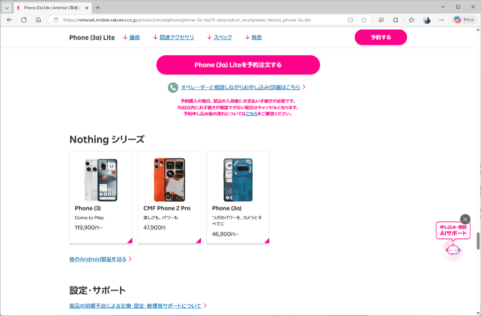 こうした事情もあってか、Nothing Phone(3a)Liteは楽天モバイルだと本体価格が3万2890円まで引き下げられており、Nothing Phone(3a)との差がつけられています。