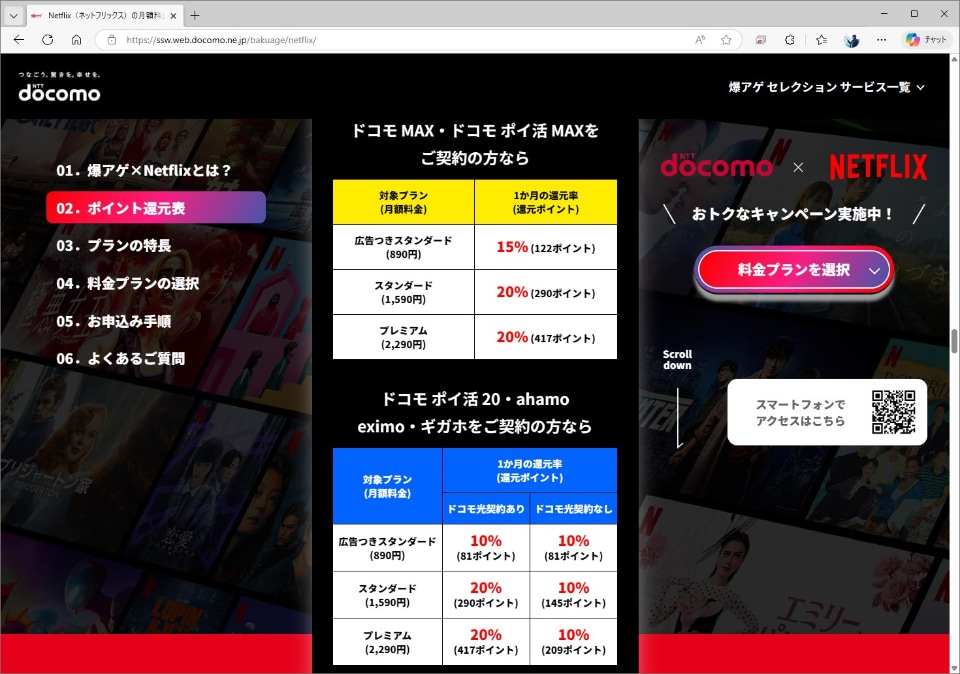 還元率は料金プランやNetflixのプランの掛け算で決まり、広告つきスタンダードでかつ「ドコモMAX」や「ドコモポイ活MAX」を契約していると15%。「ドコモ ポイ活20」や「ahamo」は10%になります。