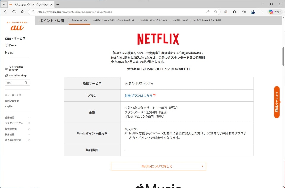 au、UQ mobileには「サブスクぷらすポイント」という特典があり、こちらも同様にNetflixが含まれています。料金プランやNetflixのプランによって還元率が変わってくる形ですが、サブスクぷらすポイントは20%、15%、10%の3段階に分かれています。