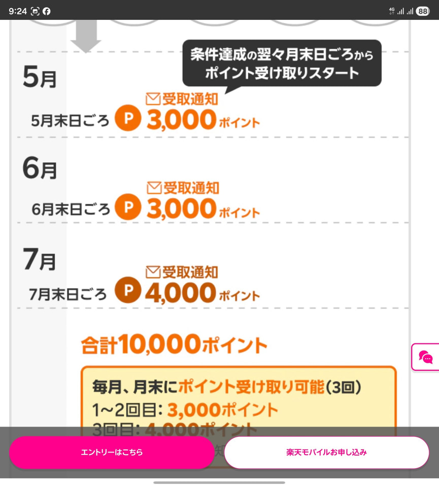 これに対し、楽天モバイルは条件達成の翌々月から、3回に渡ってポイント還元する形を取っています。条件をすべて契約直後に満たしたとしても、すべてのポイントを受け取れるのは5カ月後ということになります。分割でのポイント付与は、その間の解約を抑止する効果があります。ユーザーにとって、損になってしまうからです。