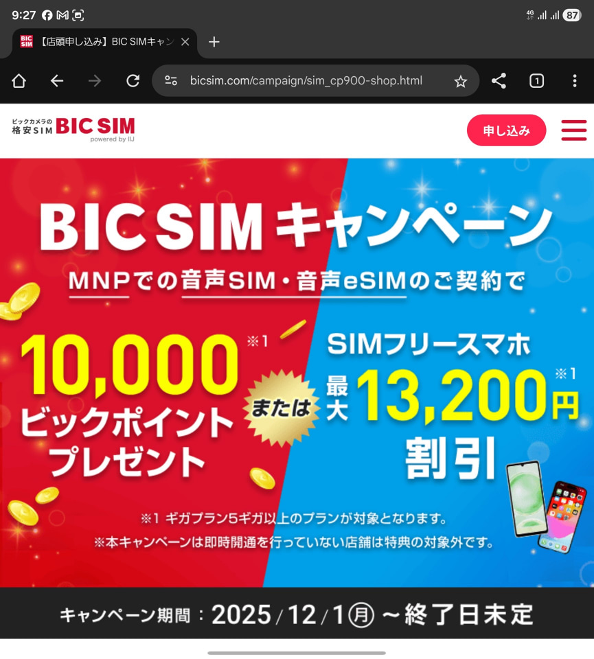 また、MVNOもSIMのみでキャッシュバックしているケースがあります。以下はIIJmioの回線をビックカメラブランドで提供しているBIC SIMのページ。こちらでは、端末割引かビックカメラのポイントでの還元を選択できるようになっています。SIMのみキャッシュバックは大手キャリアだけの特権ではないというわけです。