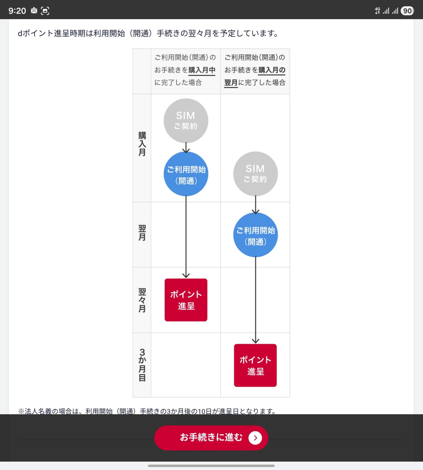 以下は、ドコモと楽天モバイルの場合。ドコモは、開通の翌々月に、指定した額のdポイントをまとめて付与する形になっています。
