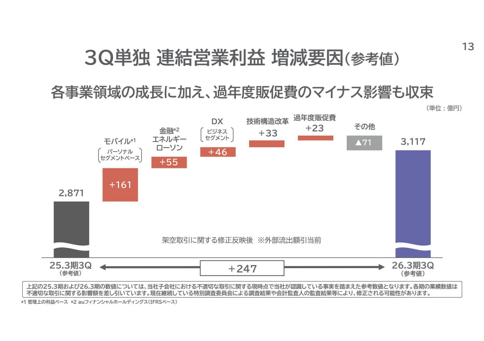 会計のお勉強的なお話になりますが、引当金とは、将来発生する可能性が高い費用や損失を、あらかじめ帳簿に計上しておくこと。営業利益のマイナス454億円には、この引当金の見直し影響も含まれています。より分かりやすく言うと、ドコモの予想よりも端末が返却される傾向がつかめたため、事前にそれを費用として第3四半期に計上したという形になります。今後発生するであろうコストに備えたとも言えます。
