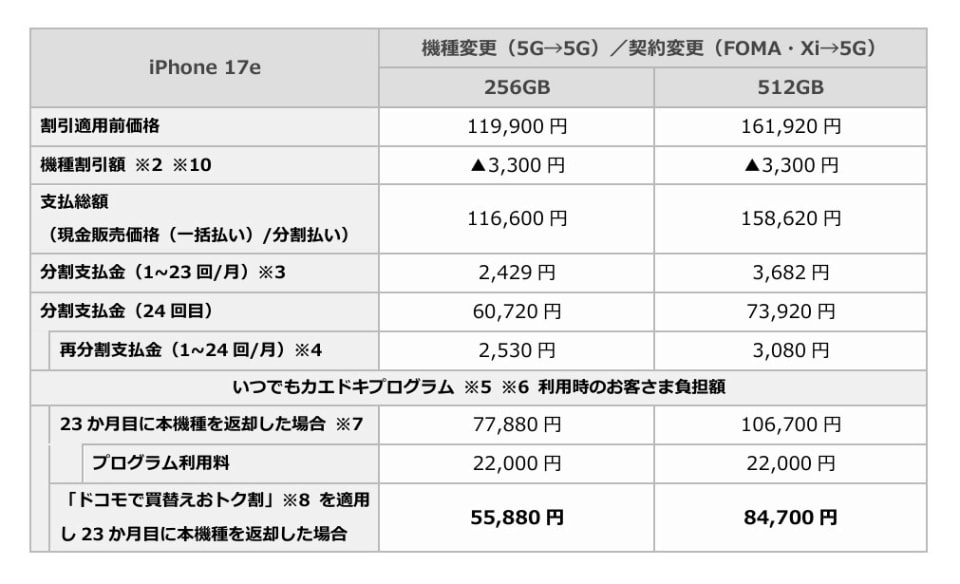 なお、ドコモはiPhone 17eの24カ月後の買取予想価格を8万333円としており、新規契約/MNP、機種変更ともに残価として免除する金額はこれを超えていません。これは、端末の下取りに割引が含まれていないことを意味しています。