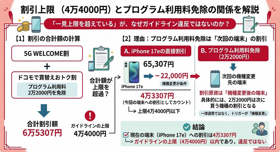 ただ、5G WELCOME割とプログラム利用料の2万2000円を免除する「ドコモで買替えおトク割」を合算すると、割引額は6万5307円になり、割引の上限である4万4000円を超えてしまいます。「すわ、ガイドライン違反か」と思われる方もいるかもしれませんが、必ずしもそうではありません。