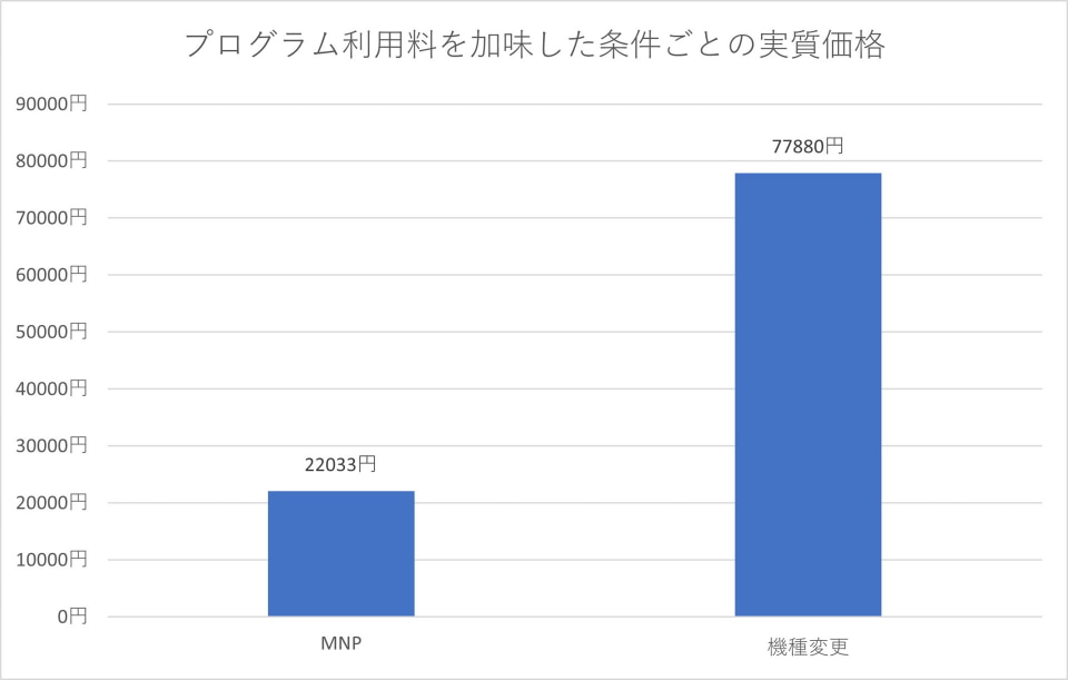ただし、上記の金額にはプログラム利用料が含まれておらず、これを合算すると実質価格はMNPで2万2033円、新規契約で6万5340円、機種変更で8万1180円になります。