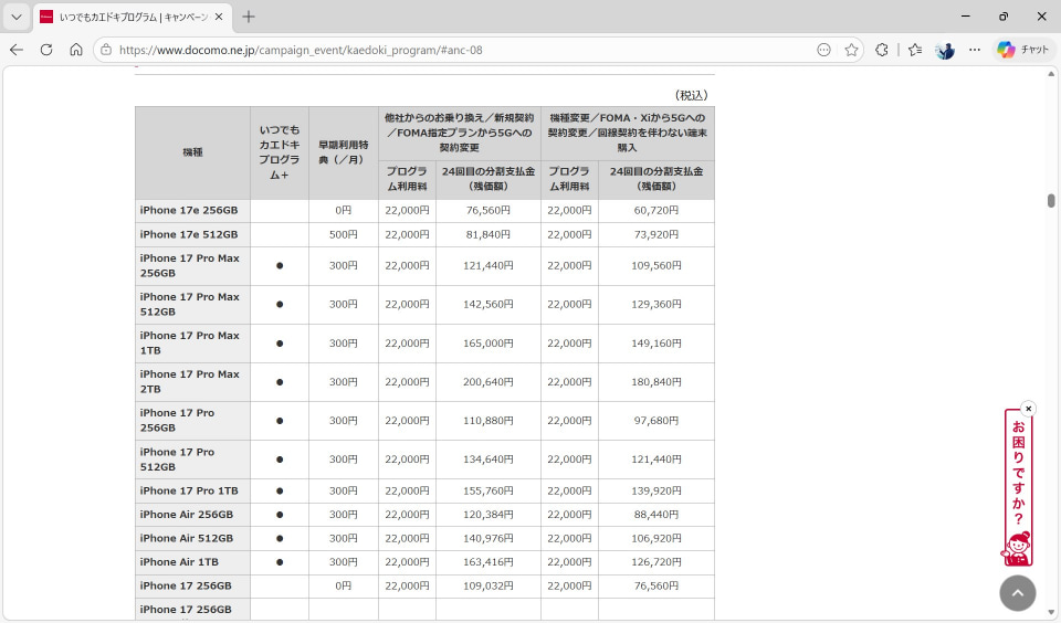 MNPや新規契約はお得な反面、プログラム利用料を含めた機種変更の実質価格はアップルが直接販売するiPhone 17eに迫る価格になっており、しかもいつでもカエドキプログラムはいわゆる残クレのため、端末が手元に残りません。