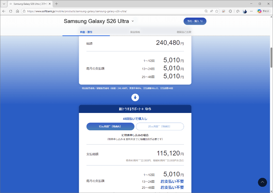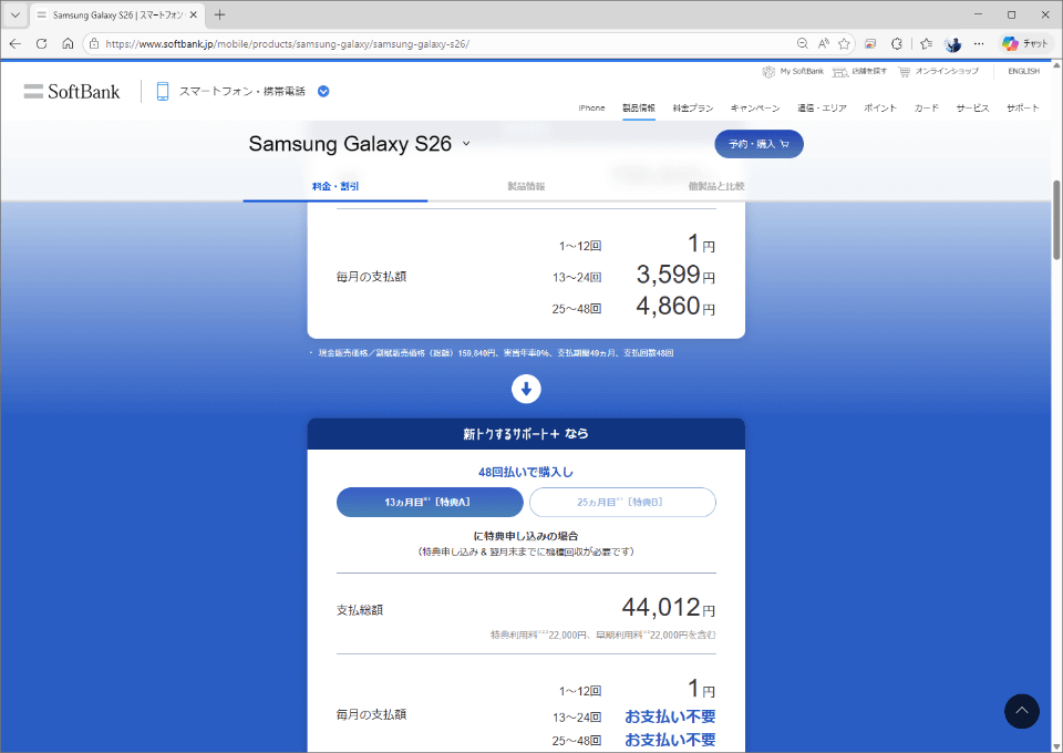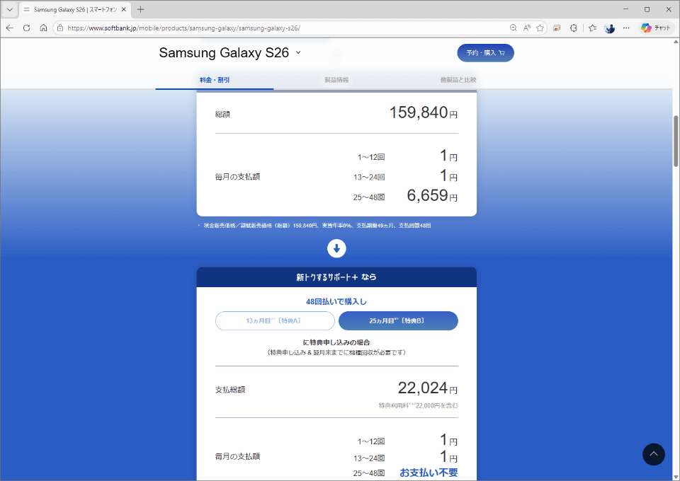 24回支払い後に端末を回収に出して免除される金額は、6659円の24回ぶん。15万9816円で本体を引き取ってくれる格好です。ただし、ソフトバンクの「新トクするサポート+」は、端末回収時に特典利用料がかかります。この料金はGalaxy S26の場合2万2000円。 トータルでの実質価格は、2万2024円 です。