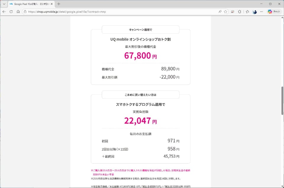 これと比べるとUQ mobileはやや高めになる一方で、「スマホトクするプログラム」が適用されると、実質価格は2万2047円と比較的安価に入手することが可能です。ただ、UQは新規だと実質4万4047円、機種変更だと実質5万4600円になり、メインブランドとあまり変わらない点には注意が必要です。