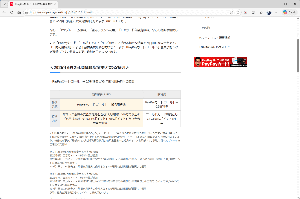 さらに、PayPayカード ゴールドは、新料金プランの導入と同日の6月2日から特典が変更になり、これまでの+0.5%の還元(ベースと合わせて1.5%)から、年間100万円以上の利用で1万1000ポイント還元に切り替わります。これが適用されれば「ペイトク2」を選択するメリットはかなり大きくなります。
