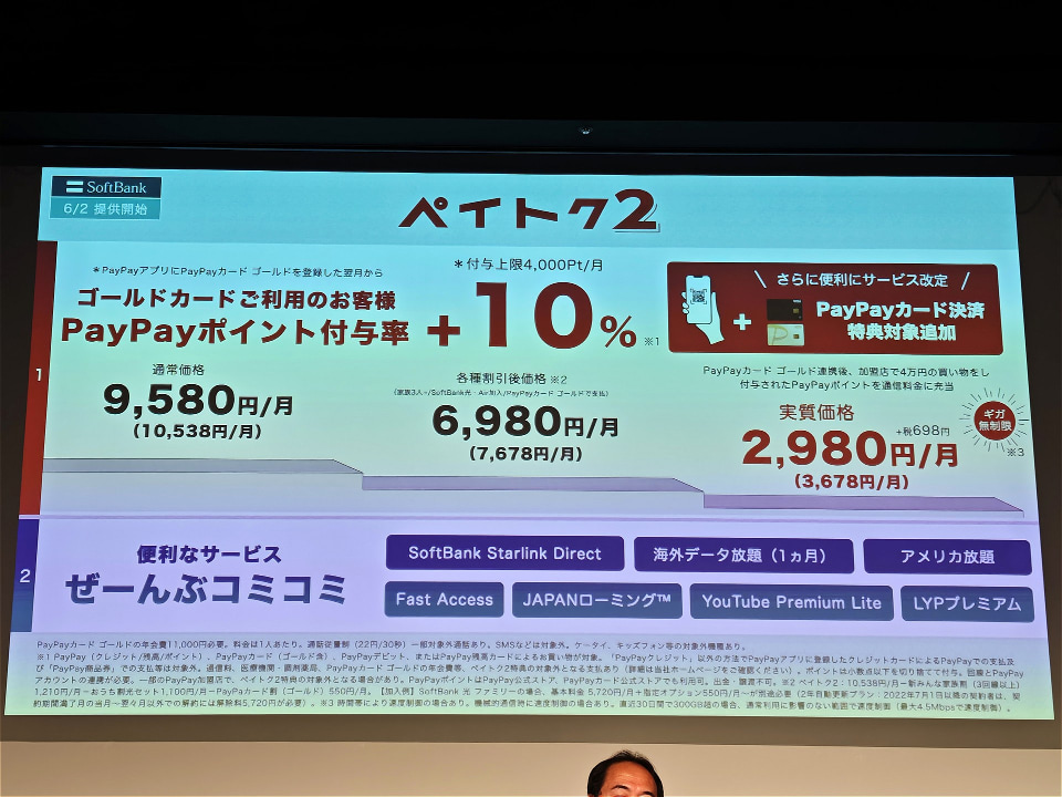 もう1つのメリットは、「SoftBank Starlink Direct」「Fast Access」に加え、1カ月分の「海外データ放題」が無料になること。前2つは値上げ後にもつきますが、現行の「ペイトク」は海外データ放題が無料になるのが5日間にとどまるため、海外利用が多い人も「ペイトク2」に変えた方がお得になることが多くなりそうです。
