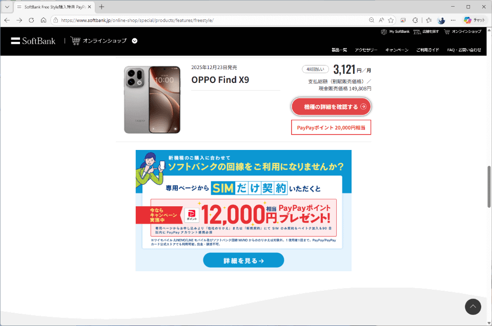SoftBank Free Styleは12回、24回、48回払いの選択が可能。こちらは、OPPOの「Find X9」を48回払いにした際には、1回あたりの支払いが3121円になります。10万円を超えると聞くと、購入を躊躇してしまうかもしれませんが、毎月3000円程度であれば余裕に感じる人も多いでしょう。負担感を抑えられるのは、魅力と言えます。