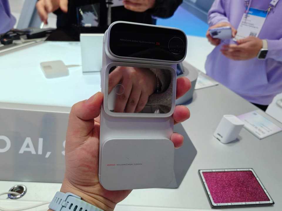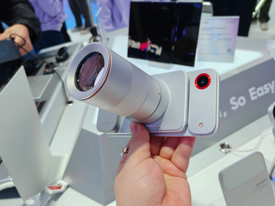 注目の200倍ズームが可能な望遠カメラモジュールは、重さのため外れやすく、スタッフから「カメラモジュール側を支えてくれ」と頼まれた。また、まだまだ開発段階ということもあり、接続が安定していない様子ではあるが、重い望遠レンズを手軽に付け外し可能な利便性には期待ができる。