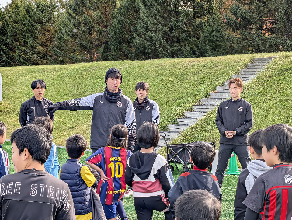 朝8時半に集合した30人の子供たちは、まず練習場において、コンサドーレのアカデミーコーチらによるサッカー教室に参加。低学年・高学年とおおまかな年齢でのグループに分かれ、オフェンスやディフェンスの動きなど、プロの指導による技術レベルアップを体験した。