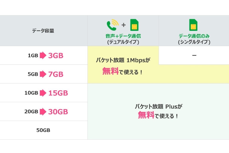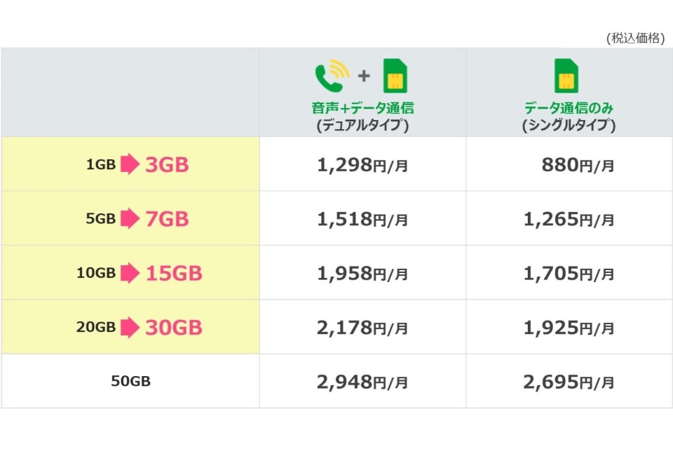今回、月額料金はそのままに、例えば1GBを3GBに、10GBを15GBに、20GBを30GBに容量アップいたします。