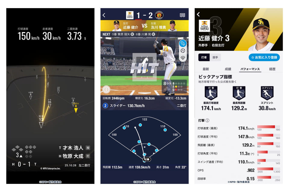 「NPB+」では、球場の外、試合を中継でご覧になれない環境下でもライブ感を体験できます。あるいは、球場にいたり、テレビの前で観戦したりしていても、選手のプレーの詳細をデータで示せます。
