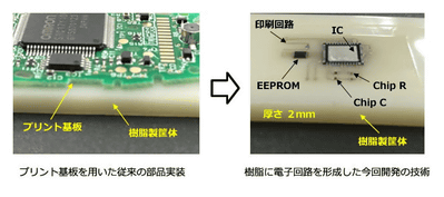 オムロンは、汎用の樹脂製パーツに電子部品を埋設し、インクジェット印刷で電子回路を形成する技術を世界で初めて開発したと発表した。