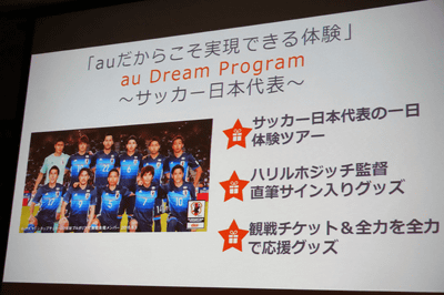 サッカー日本代表や「三太郎」に関するものは「au Dream Program」というサービスに位置付けられ、auだからこそ実現できる体験、価値を提供するもの、とされている。