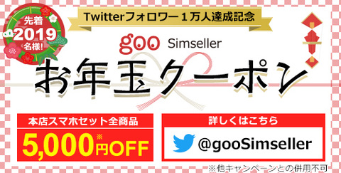 NTTレゾナントは、「gooSimseller」公式Twitterアカウントのフォロワー数が1万人に到達したことを記念して、gooSimseller本店で利用できる5000円引きの「お年玉クーポン」を配布する。