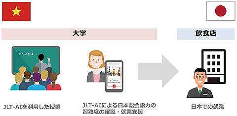 対象者となるハノイ大学の学生には、ドコモが開発した外国人向け日本語会話学習アプリ「Jappanese Language Training AI(JLT-AI)」が試験提供される。同プロジェクトで使用されるものは、店舗流通ネットによる外食産業分野向けのコンテンツ、「仕事で必要な日本語力」というスキルレベルを可視化した検定コンテンツを収録したもの。