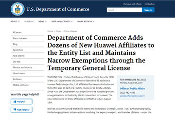 2019年5月に同省は、ファーウェイおよびその関連会社を米国政府の許可なしでは米国製品を輸出できない規制リスト(エンティティリスト)に追加していた。その後、90日間ごとに限定的な取引を認める期間を延長してきている。2019年11月の発表では、2020年2月16日(現地時間)まで取引が認められることになっていたが、今回の発表で期限を迎える前にさらに延長された。