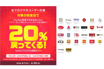 Yahoo!プレミアム会員の還元率が25%で、それ以外のユーザーの還元率は20%となる。PayPayボーナスで還元され、ヤフーカードなどの支払い方法は対象外。1回あたりの決済における還元上限は2000円で、期間中の上限は3000円。