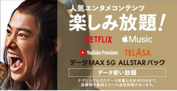 データ使用量無制限の5G料金プラン「データ MAX 5G ALL STARパック」を発表。動画配信サービス「Netflix」(ベーシックプラン)「Youtube Premium」「TELASA」(見放題プラン)に加えて音楽配信の「AppleMusic」がセットで利用できる。6月25日から。