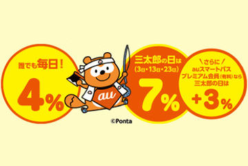 3の付く日である三太郎の日であれば7%還元、auユーザーであれば10%還元になる。さらにauスマートパスプレミアム会員は最大13%(200円につき26ポイント)の還元になる。