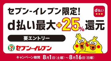 この他、全国のセブン-イレブンにおいてd払いで支払うと、通常の還元に加えて最大で+25%を還元するキャンペーンが実施される。期間は8月16日まで。