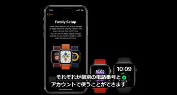 Apple Watch Series 4以降では、新たに「ファミリー共有設定」という機能が用意され、Apple Watch単体で通話や通信ができるようになる。家族のうち、子供にはスマホを持たせずApple Watchだけ身につける、といった利用が想定されている。