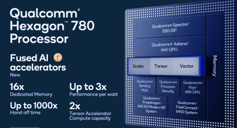 完全に再設計されたとうたう第6世代の「Qualcomm AIエンジン」を、新たな「Qualcomm Hexagon 780」プロセッサーで処理し、カメラ、音声アシスタント、ゲーミングなどで活躍する。