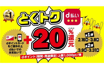 事前エントリーの上、対象店舗でdポイントカードを提示しd払いで決済したユーザーに、通常に加えて利用金額の20%分をdポイントで還元する。