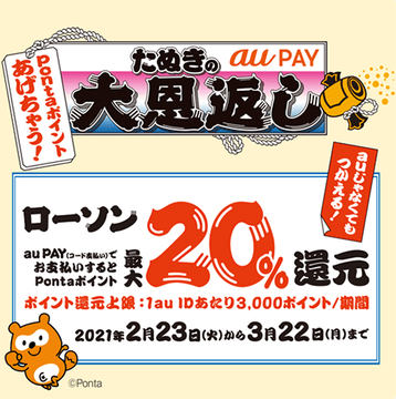 対象店舗でau PAYのコード決済(コード表示と読み取り)で決済すると、20%分(200円ごとに40ポイント)をPontaポイントで還元する。還元上限は、期間合計3000ポイント。