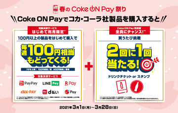 また、Coke ON Payでコカ・コーラ社製品を購入したユーザー全員を対象に、ドリンクチケットやスタンプがあたる「2回に1回当たるくじ」キャンペーンを実施する。