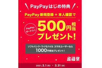 「PayPay」に新規登録し、本人確認(eKYC)ユーザーに500円相当のPayPayボーナスを付与する。ソフトバンクとワイモバイルのスマホユーザーが新規登録する場合、1000円相当付与される。