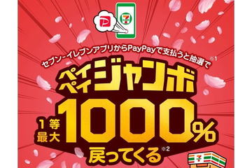 全国のセブン-イレブン店舗で「セブン-イレブンアプリ」からPayPayで支払うと、1等で決済金額の1000%、2等で100%、3等で1%のPayPayボーナスが付与される。