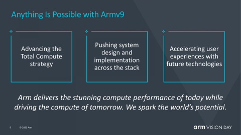 Armv9は、Armの最新型アーキテクチャー。現世代のArmv8から10年ぶりの刷新となる。同社では、3000億個の最先端のArmベースチップを支えるもので、汎用コンピューティングの経済性、設計の自由度、入手の容易さなどの優位性があり、用途に特化した処理を実現するという。