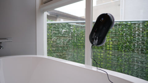 「HOBOT388」は、吸着モーターで窓や壁に張り付き、自動で掃除するロボット掃除機。掃除範囲はAIが自動認識し、一般的な掃き出し窓一面だと約5分で掃除が完了するという。