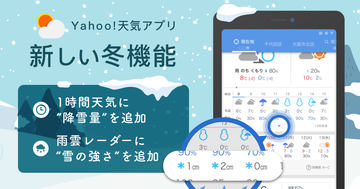 「Yahoo!天気」アプリでは、1時間ごとの天気予報に降雪量を表示したり、雨雲レーダーで雪の強さを3段階で表示したりすることができる。
