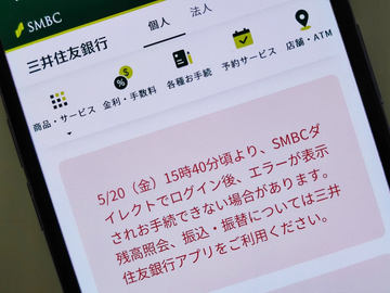 三井住友銀行については、20日15時40分ごろから、インターネットバンキング「SMBCダイレクト」でエラーが表示される事象が発生している。
